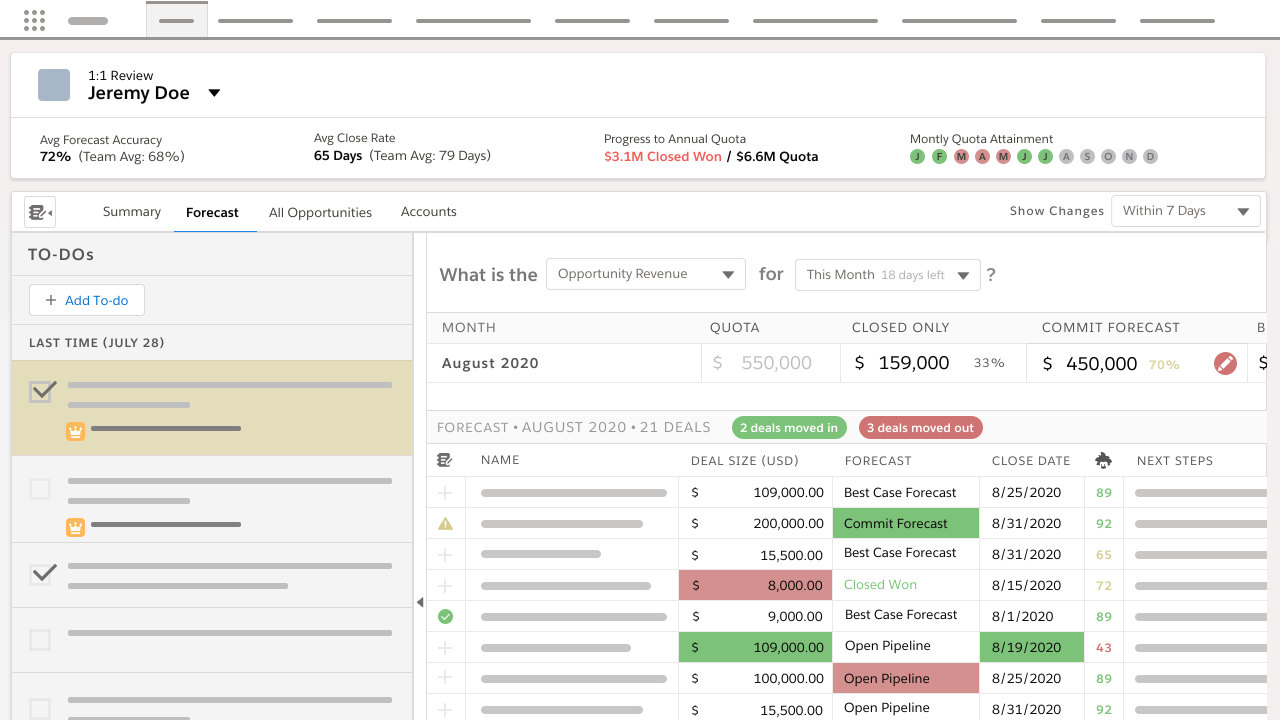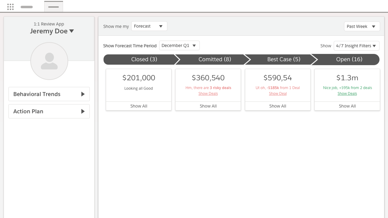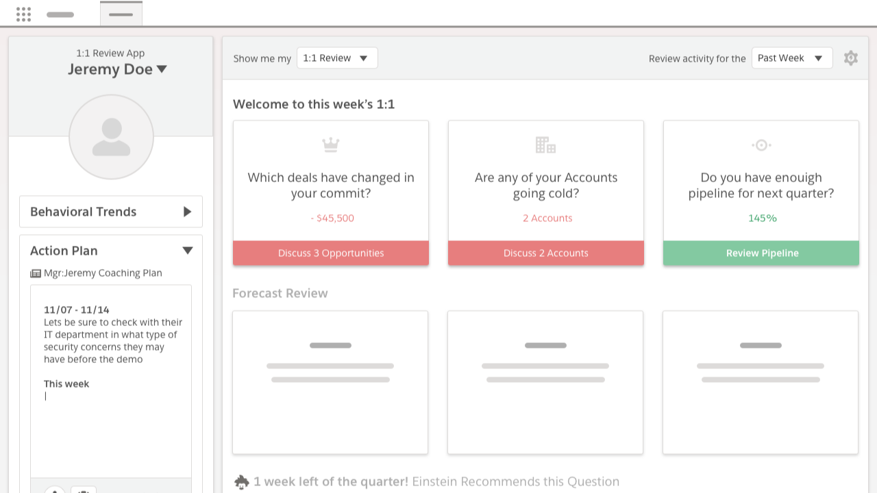 Managers know what types of information they want discuss but they need help finding it. Such as any major changes to deals, the kinds of activities the reps are performing, and whether or not they are completing agreed upon tasks from the last 1:1.